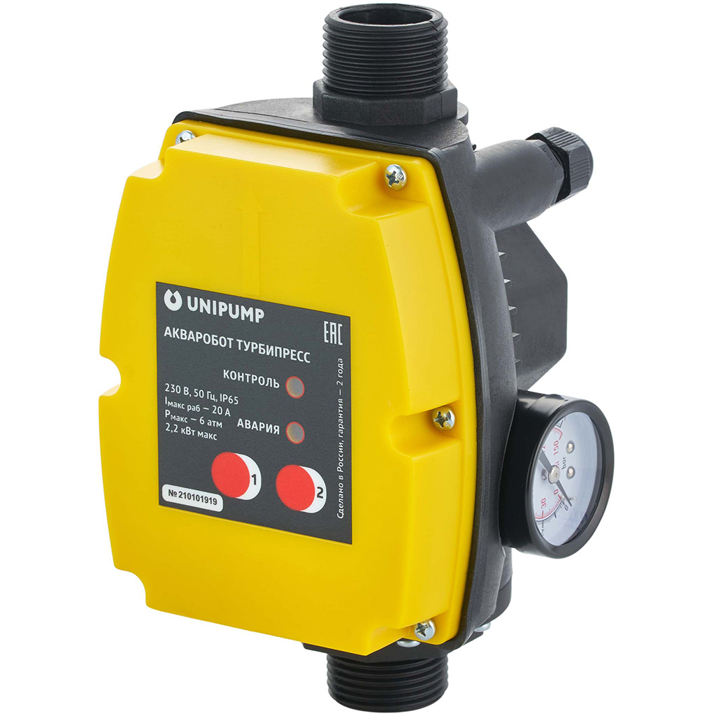 Блок управления насосом UNIPUMP ТУРБИПРЕСС 2,2 кВт (NEW) — автоматика для однофазных поверхностных и погружных насосов до 2,2 кВт в системах водоснабжения. Автоматически поддерживает давление (настройка Pмин 0,5-3 бар, Pмакс 1,5-5 бар), защищает от сухого хода, отсутствия потока и перегрузки с пробными пусками. Резьба 1", макс. давление 6 бар, ток 20 А, стабильная работа при 170-250 В, IP65.