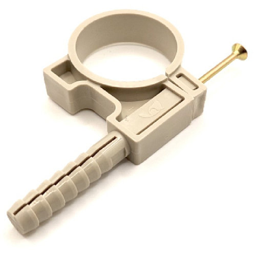 Дюбель-хомут из полипропилена служит для быстрого и надёжного крепления труб, кабелей или проводов диаметром 40 мм к бетонным, каменным, кирпичным и другим твёрдым основаниям, а также – к пустотелым кирпичам и пустотелым блокам. Обеспечивает лёгкий монтаж. Хомут уже с дюбелем и укомплектован шурупом нужной длины. Вам остается только просверлить отверстие, вставить хомут и вкрутить шуруп. Дюбель-хомут устойчив к механическим нагрузкам и гидроударам. Разъемное крепление позволяет легко и быстро вставить трубу в хомут. Наружное, смещенное расположение шурупа и эластичность хомута позволяют легко закрепить в нем трубу уже проложенной магистрали, без смещения оси. Конструкция хомута позволяет крепить в нем трубы с увеличенным наружным диаметром. Благодаря хомутному типу крепления может быть использован как подвижная и как неподвижная опора. Изделие предназначено для эксплуатации в широком диапазоне температур, учитывающих условия эксплуатации трубопроводов для горячего водоснабжения и отопл