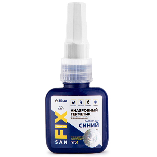 Герметик анаэробный 15мл, синий ТМ SANFIX (резьбовой уплотнитель) – жидкое полимерное вещество, применяемое для герметизации металлических резьбовых соединений. Попадая в узкое безвоздушное пространство при соприкосновении с металлом материал полимеризуется (затвердевает), полностью перекрывая собой имеющееся свободное пространство внутри узла.