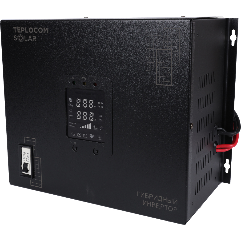 Гибридный инвертор TEPLOCOM SOLAR предназначен для питания устройств с номинальным напряжением 220 В переменного тока энергией, накопленной в АКБ, полученной от солнечных панелей, или от сети ~220 В. Инвертор обеспечивает: Чистый синус на выходе, что позволяет подключать холодильники, вентиляторы, электронасосы и пр. Эффективную зарядку АКБ с помощью технологии MPPT (Maximum Power Point Tracking). Интеллектуальный выбор режима питания нагрузки, что существенно увеличивает энергосбережение. Защиту от перегрузки, КЗ, перенапряжения, пониженного напряжения, перегрева и т. п. Удобный интерфейс и индикацию режимов работы, ошибок, напряжения и тока.