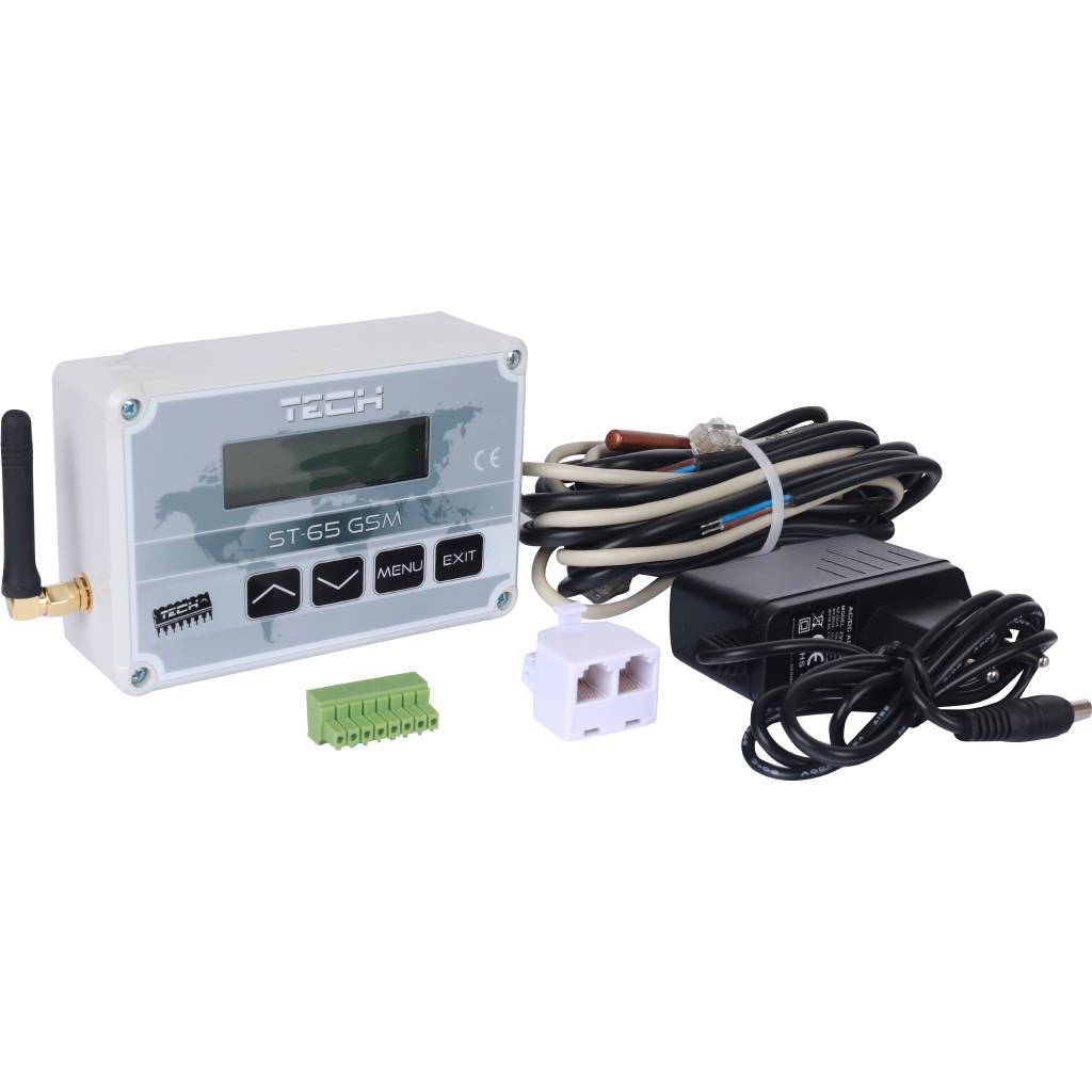 GSM-модуль работает с контроллерами TECH с RS-связью и позволяет дистанционно контролировать работу котла с помощью мобильного телефона. Пользователь информируется СМС-сообщением о каждой тревоге контроллера котла, кроме того, в любое время при отправке соответствующего СМС-сообщения, получает ответное сообщение с информацией о текущей температуре всех активных датчиков. После ввода кода авторизации, возможно также дистанционное изменение заданных температур.