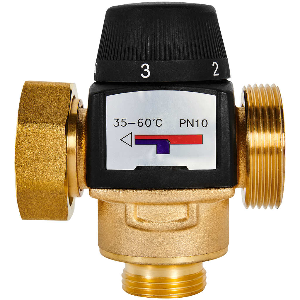 Клапан монтируется непосредственно на коллекторную группу RDG-1002, выполняя функцию узла смешения. Он подмешивает остывший теплоноситель из обратной линии в горячий поток подачи, обеспечивая на выходе стабильную, безопасную и энергоэффективную температуру.