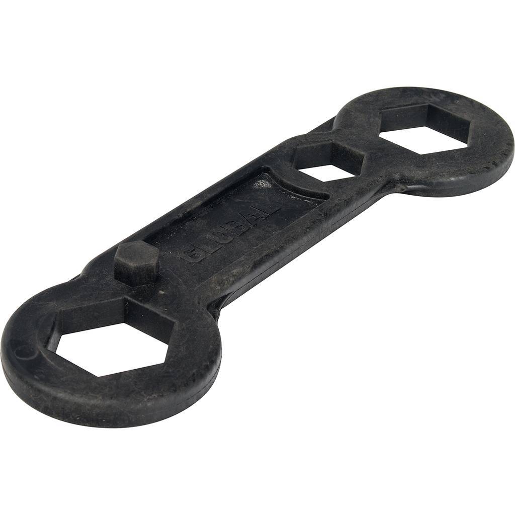Ключ для переходников (футорок) Global — это инструмент для работы с пробками и воздухоотводчиками алюминиевых и биметаллических радиаторов. Изготовлен из нейлона, обеспечивает безопасное и точное соединение без повреждения покрытия. Размеры под ключ: 42, 32 и 22 мм.