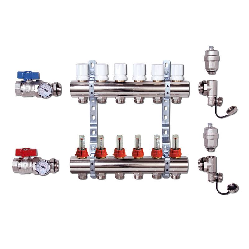 — Обратный коллектор со встроенными вентилями с маховичком для ручной регулировки. Вентили предусматривают возможность термоэлектрической регулировки при помощи термоголовки.