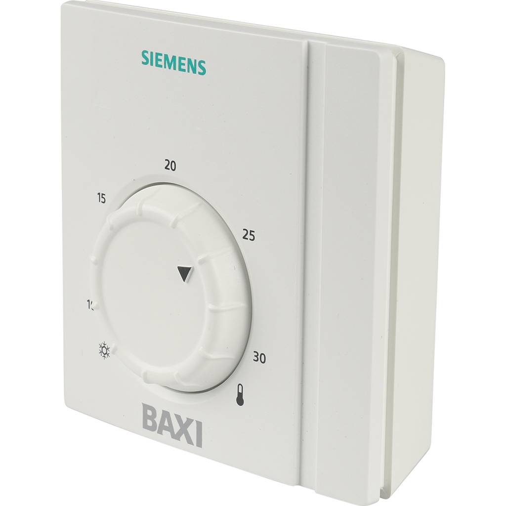 Котлы Baxi используются с соответствующими аскессуарами для регулирования температуры. Комнатный механический термостат от SIEMENS для котлов Baxi позволяет запрограммировать котел на экономный режим работы, при котором комфортная температура в помещении позволит не запускать котел без необходимости. Данная модель термостата обеспечивает регулирование температуры в пределах от 8 до 30°С. Максимальные напряжение и ток на контактах составляют 250 В, 16 А.