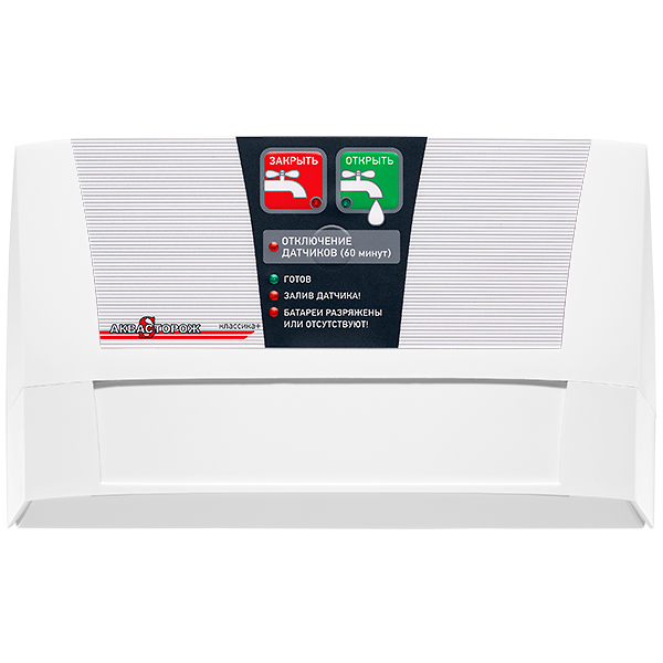 При попадании воды на подключенные датчики осуществляется автоматическое перекрытие подачи воды.