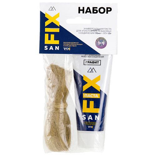 Набор: паста 70мл в тубе, графит + лён 15г ТМ SANFIX (резьбовой уплотнитель) - используется для уплотнения резьбовых соединений при монтаже трубопроводных коммуникаций, установке запорной и регулирующей арматуры, счетчиков. Является более эффективной, надежной и безопасной альтернативой пакле со свинцовым суриком и другим уплотнительным материалам. Обработка льна пастой Sanfix предупреждает его гниение, ломкость, появления насекомых и грызунов, эти факторы являются важными при эксплуатации и хранении льняного волокна.