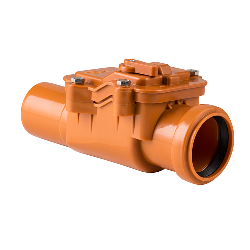 Клапан обратный канализационный ТМ РТП диметром 110 мм системы BETA ORANGE с запирающей заслонкой из профилированной нержавеющей стали с язычковым уплотнением, с ревизионной крышкой и присоединительными выходами под раструбные трубы ПП, с возможностью фиксации заслонки в закрытом состоянии при помощи ручного фиксатора с предохранителем от самопроизвольного закрытия.