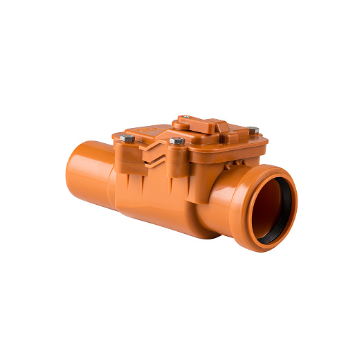 Клапан обратный канализационный ТМ РТП диметром 50 мм системы BETA ORANGE с запирающей заслонкой из профилированной нержавеющей стали с язычковым уплотнением, с ревизионной крышкой и присоединительными выходами под раструбные трубы ПП, с возможностью фиксации заслонки в закрытом состоянии при помощи ручного фиксатора с предохранителем от самопроизвольного закрытия.