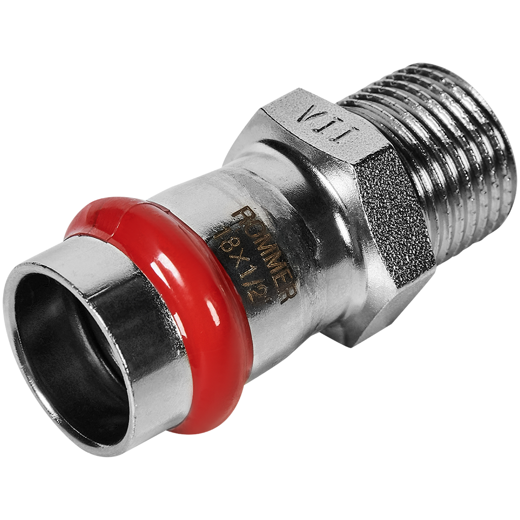Данный пресс-фитинг является переходником с наружной резьбой и служит для герметичного соединения трубопроводов или оборудования с разными типами и размерами присоединений. С одной стороны фитинга расположена наружная резьба диаметром 18 мм, а с другой — наружная резьба 1/2 дюйма. Такая конструкция делает его незаменимым при монтаже и ремонте систем, где необходимо состыковать элементы с метрической и дюймовой резьбой.