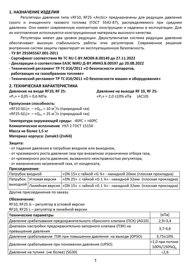 Единственные комбинированные регуляторы давления газа RF Arctic 25 G, специально разработанные и изготовленные для использования в зимних условиях с температурой эксплуатации -50 °С на территории Российской Федерации.