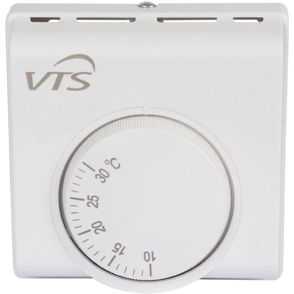 Термостат VTS VR (IP30) — это проводной комнатный регулятор, предназначенный для автоматического управления температурой воздуха в помещении, где установлены тепловентиляторы или другое климатическое оборудование VTS. Устройство позволяет пользователю вручную устанавливать желаемую температуру в диапазоне от 10 до 30 °C с помощью удобного поворотного регулятора. Благодаря классу защиты IP30, термостат защищен от попадания твердых предметов размером более 2,5 мм и может безопасно использоваться в жилых, офисных или коммерческих помещениях с нормальным уровнем влажности. Основные функции включают контроль работы вентилятора (ручной выбор скорости или автоматический режим), что обеспечивает комфортный микроклимат и энергоэффективную работу системы отопления или охлаждения. Компактный и интуитивно понятный в управлении, этот термостат обеспечивает надежное и точное поддержание заданных параметров.