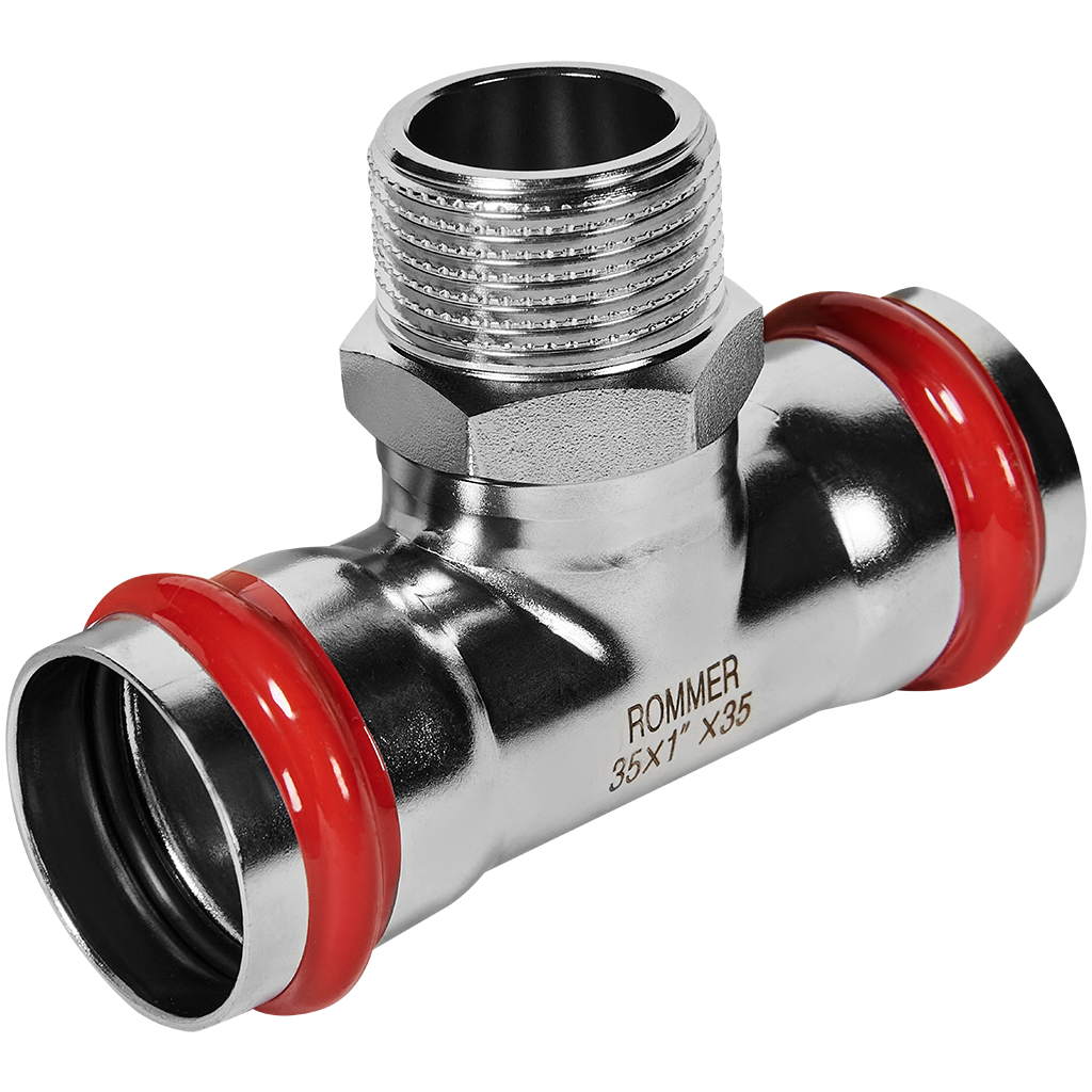 Данный тройник-переходник оснащен наружной резьбой (НР) двух типоразмеров: 35 мм и 1 дюйм. Такая конструкция позволяет выполнять ответвление от магистральной линии и подключать оборудование или контур с другим условным проходом. Фитинг относится к категории прессовых (обжимных), что обеспечивает быстрое и герметичное соединение без применения сварки, резьбового уплотнения или пайки.