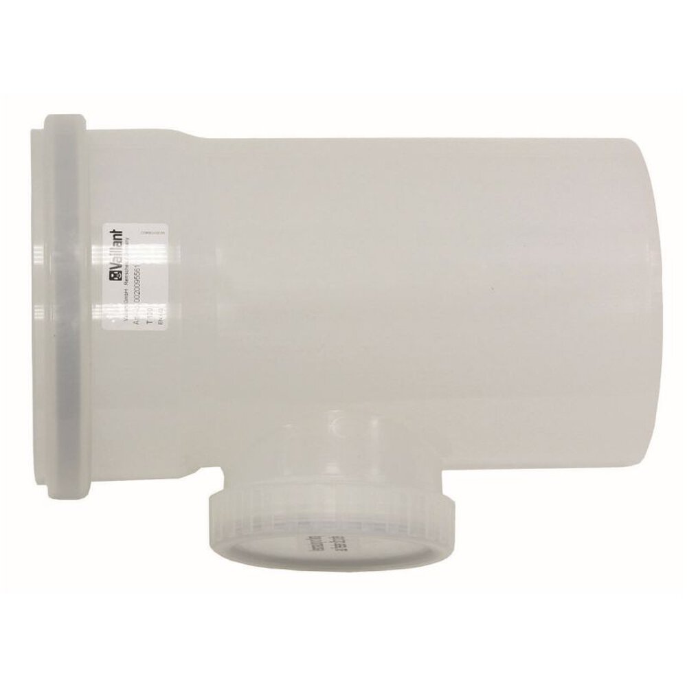 Тройник Vaillant с ревизионным отверстием диаметром 160 мм для каскадных систем обеспечивает ветвление дымоходного тракта с доступом для чистки через съемную крышку в полипропиленовых конструкциях конденсационных котлов. Элемент из нержавеющей стали соединяется раструбом, выдерживает конденсат с pH 3-7, температуру до 140°C, подходит для горизонтального или вертикального монтажа в каскадах мощностью 35-120 кВт.