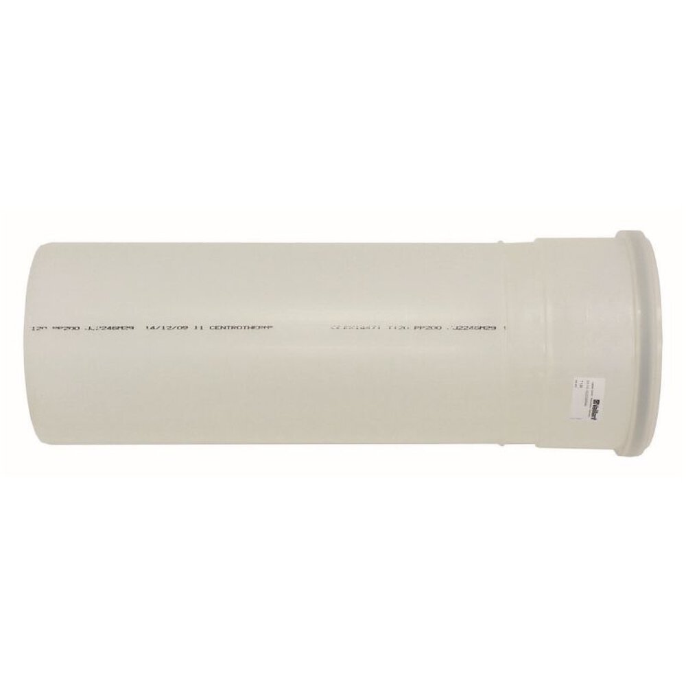 Удлинение Vaillant 500 мм диаметром 200 мм для каскадных систем продлевает дымоходный тракт в полипропиленовых конструкциях конденсационных котлов. Труба соединяется раструбом, выдерживает конденсат с pH 3-7, температуру до 140°C, подходит для горизонтального или вертикального монтажа в каскадах мощностью до 200 кВт.